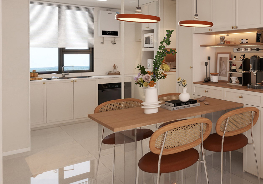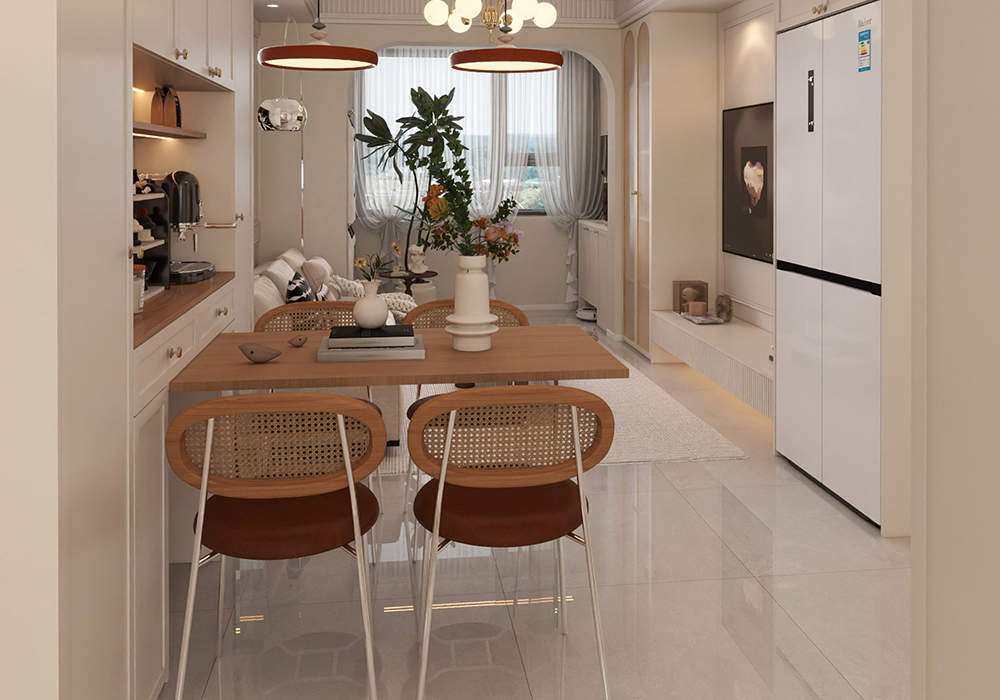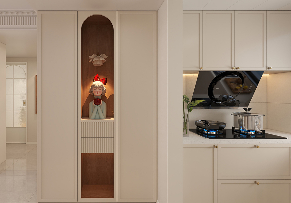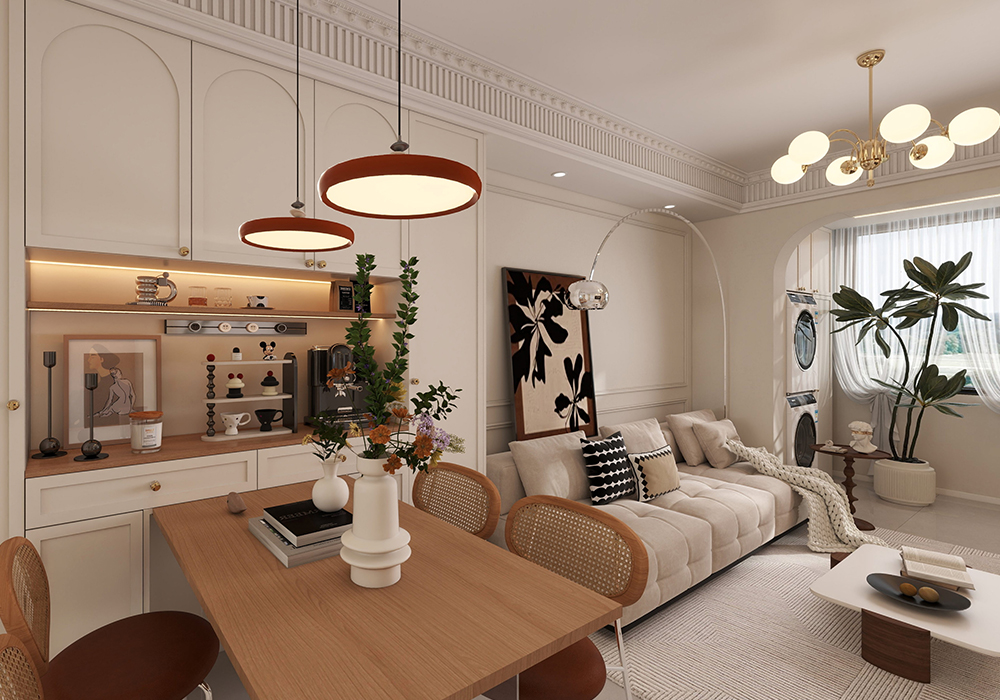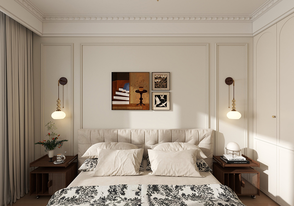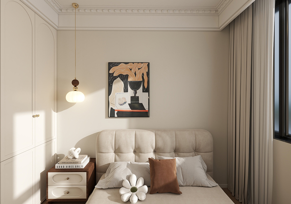 本设计以低饱和度的奶油色系为基调,融合法式经典的雕花线条与现代极简的舒适理念,旨在打造一个轻盈、温暖且充满治愈感的居住空间。