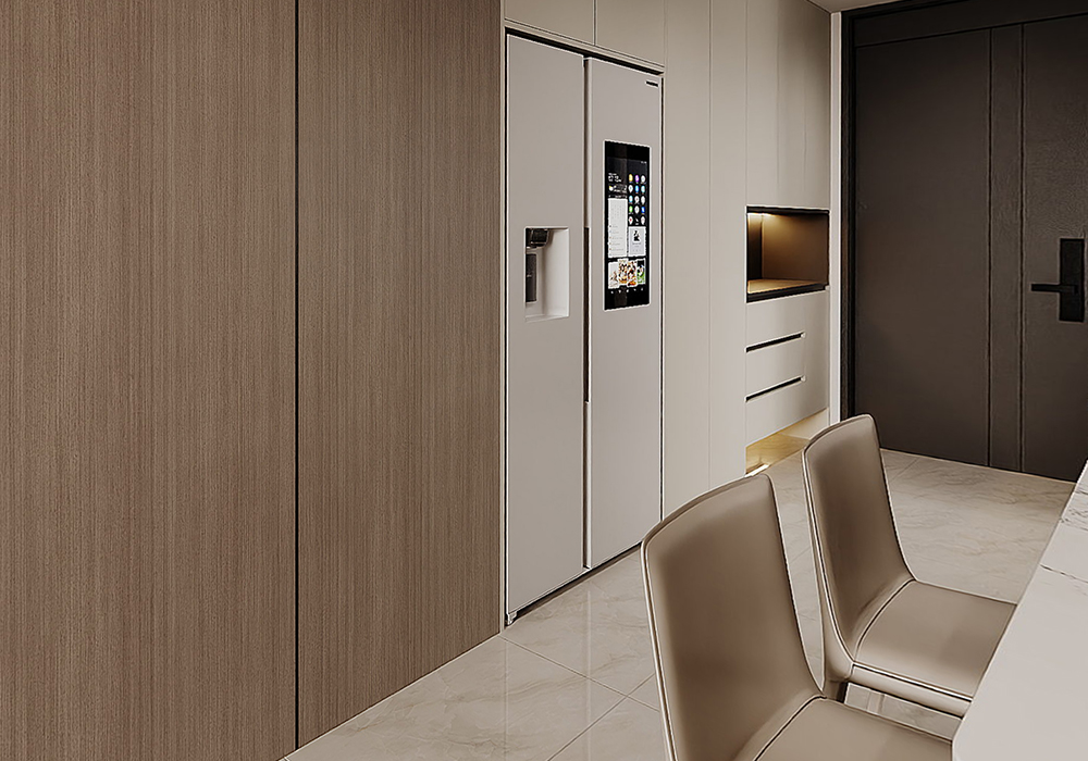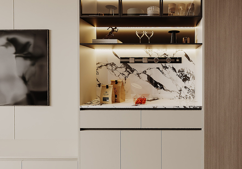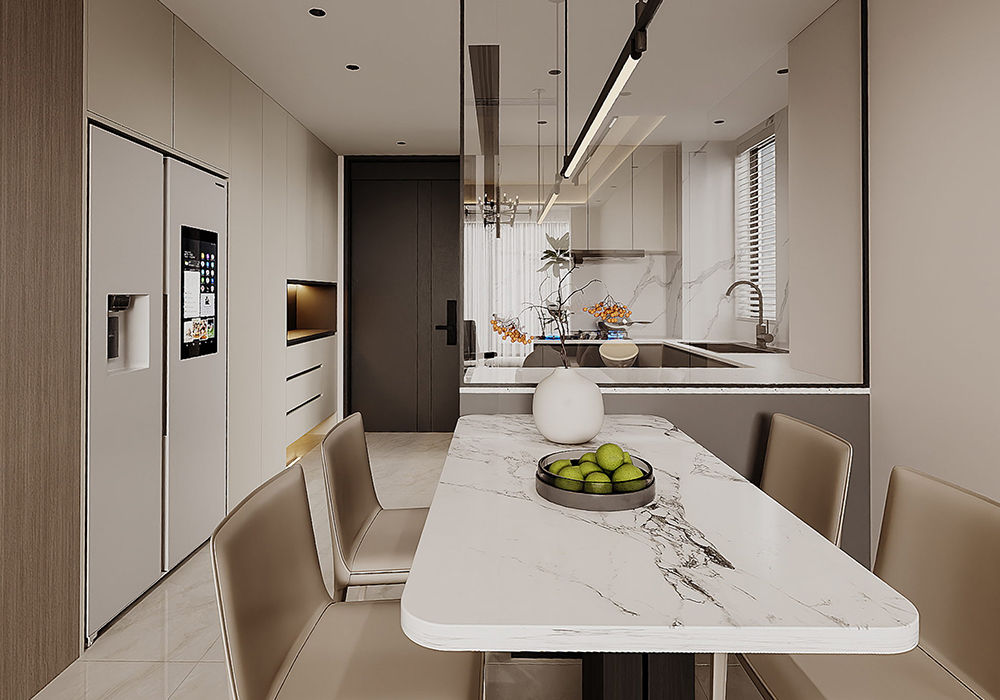 餐厅区域:延续整体色调,配置简约岩板餐桌。餐边墙同样定制通顶木制餐边柜,将冰箱、烤箱等电器嵌入,保持立面绝对整洁,功能强大且外观极简。