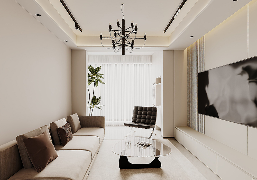 客厅区域:摒弃传统电视墙,打造整面墙的嵌入式组合柜。柜体采用浅色原木或烟熏木饰面,开放格与封闭柜门结合,兼具展示与收纳功能,与灰白背景形成冷暖对比,成为空间视觉主体。
