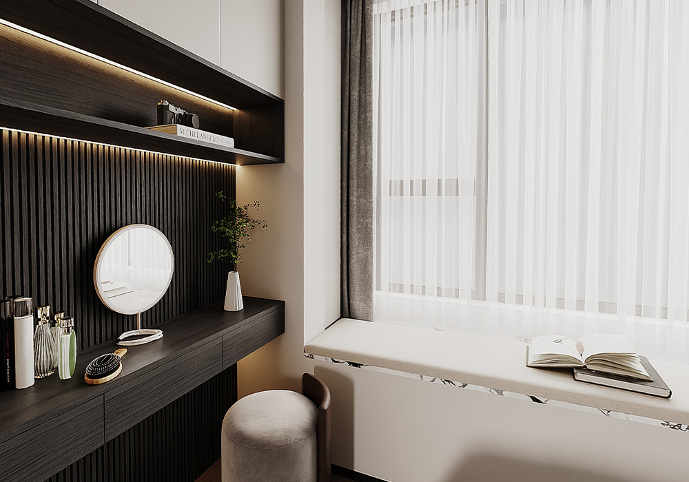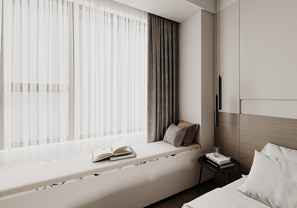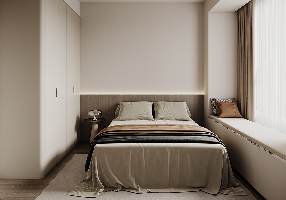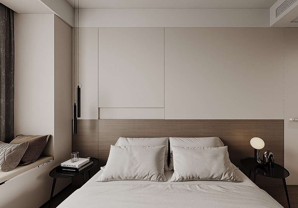 卧室区域:定制整墙木色衣柜,采用无拉手设计,立面简洁如装饰墙。床头背景墙可采用灰色硬包与木格栅相结合,营造静谧安然的休憩氛围。